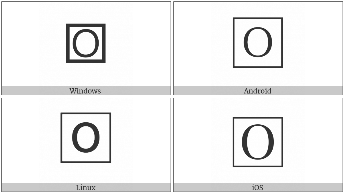 The image below shows how the “Squared Latin Capital Letter O” symbol might look like on different operating systems. If the font in which this web site is displayed does not contain the symbol and there is no fallback font able to render it, you can use the image below to get an idea of what it should look like.