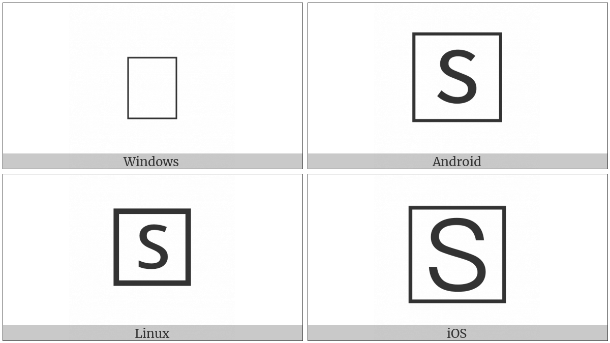The image below shows how the “Squared Latin Capital Letter S” symbol might look like on different operating systems. If the font in which this web site is displayed does not contain the symbol and there is no fallback font able to render it, you can use the image below to get an idea of what it should look like.