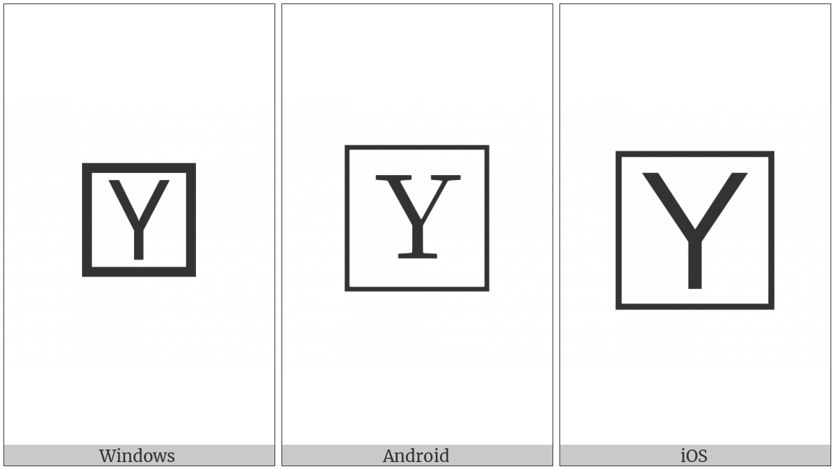 The image below shows how the “Squared Latin Capital Letter Y” symbol might look like on different operating systems. If the font in which this web site is displayed does not contain the symbol and there is no fallback font able to render it, you can use the image below to get an idea of what it should look like.