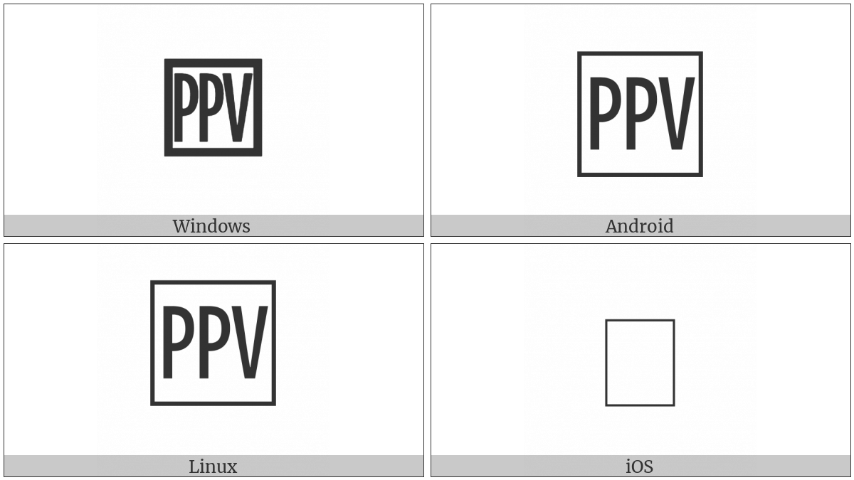 The image below shows how the “Squared Ppv” symbol might look like on different operating systems. If the font in which this web site is displayed does not contain the symbol and there is no fallback font able to render it, you can use the image below to get an idea of what it should look like.