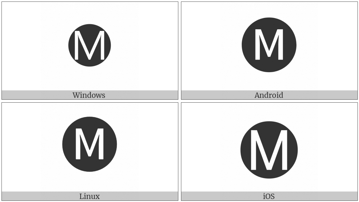 The image below shows how the “Negative Circled Latin Capital Letter M” symbol might look like on different operating systems. If the font in which this web site is displayed does not contain the symbol and there is no fallback font able to render it, you can use the image below to get an idea of what it should look like.