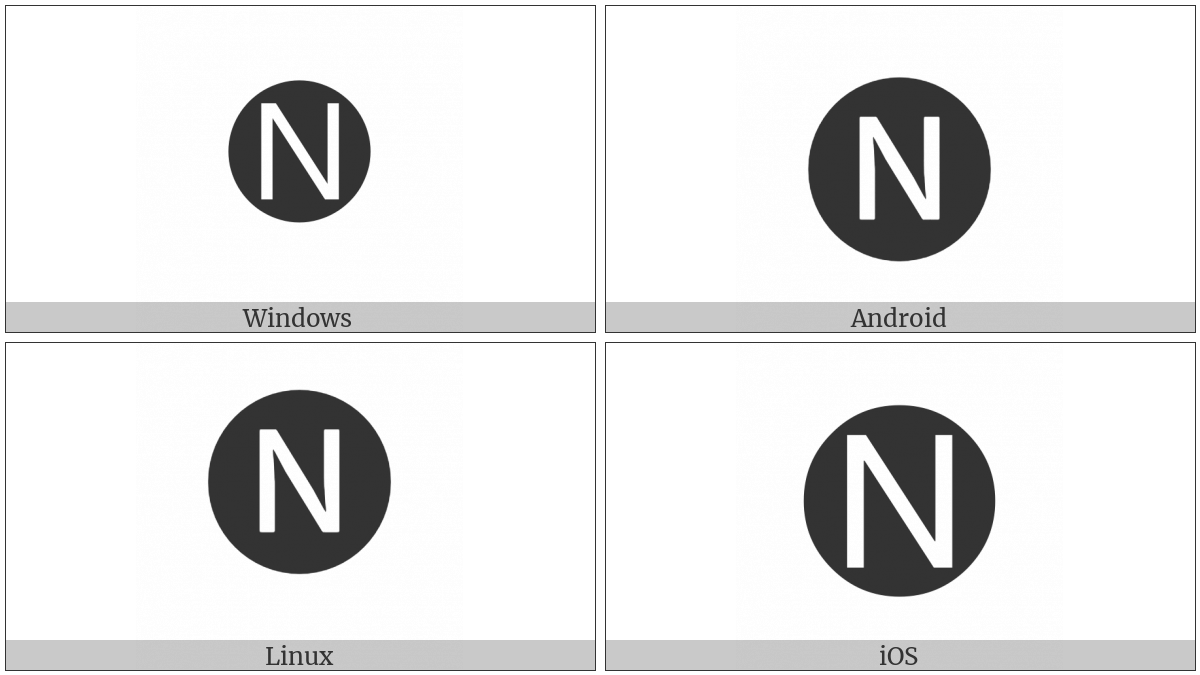 The image below shows how the “Negative Circled Latin Capital Letter N” symbol might look like on different operating systems. If the font in which this web site is displayed does not contain the symbol and there is no fallback font able to render it, you can use the image below to get an idea of what it should look like.