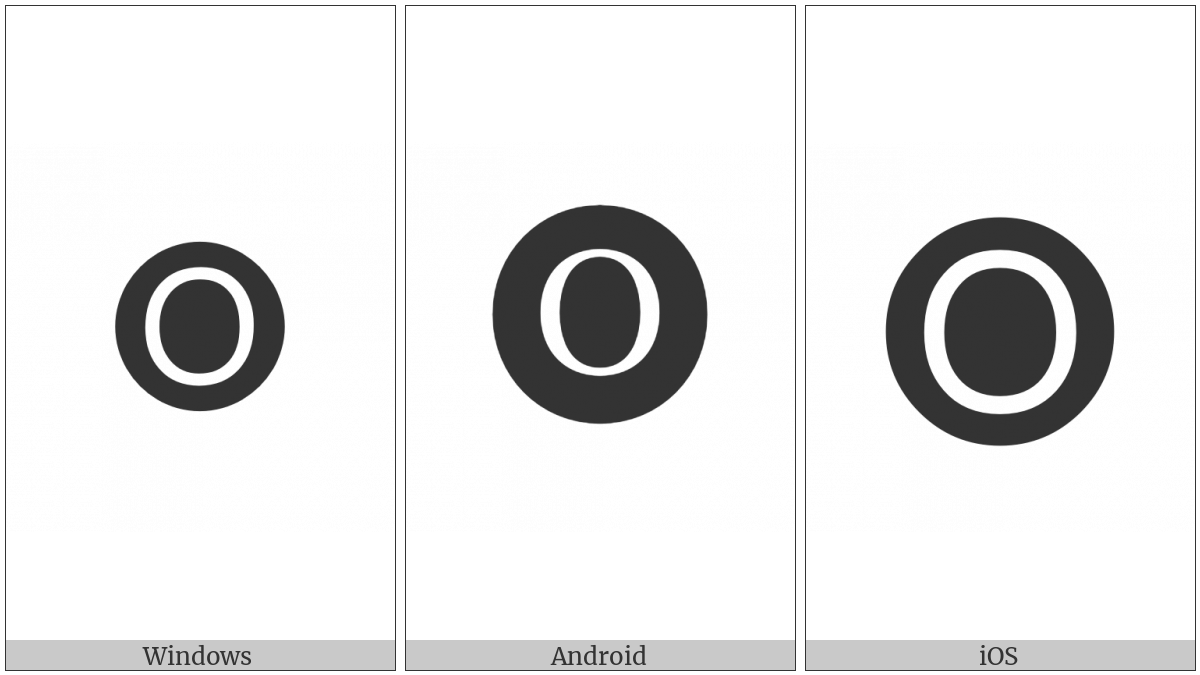 The image below shows how the “Negative Circled Latin Capital Letter O” symbol might look like on different operating systems. If the font in which this web site is displayed does not contain the symbol and there is no fallback font able to render it, you can use the image below to get an idea of what it should look like.
