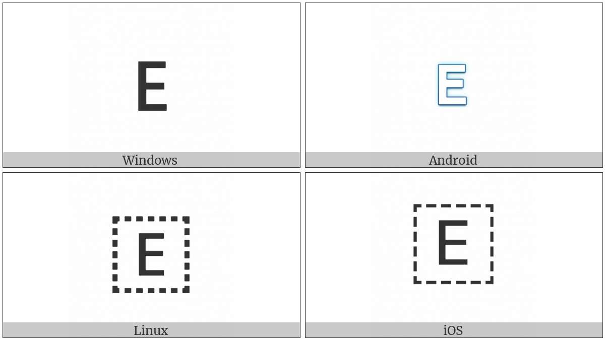 The image below shows how the “Regional Indicator Symbol Letter E” symbol might look like on different operating systems. If the font in which this web site is displayed does not contain the symbol and there is no fallback font able to render it, you can use the image below to get an idea of what it should look like.