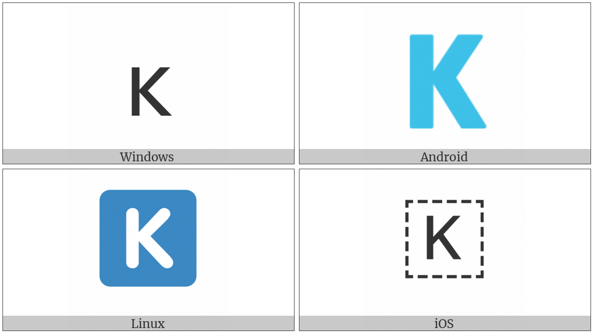 The image below shows how the “Regional Indicator Symbol Letter K” symbol might look like on different operating systems. If the font in which this web site is displayed does not contain the symbol and there is no fallback font able to render it, you can use the image below to get an idea of what it should look like.