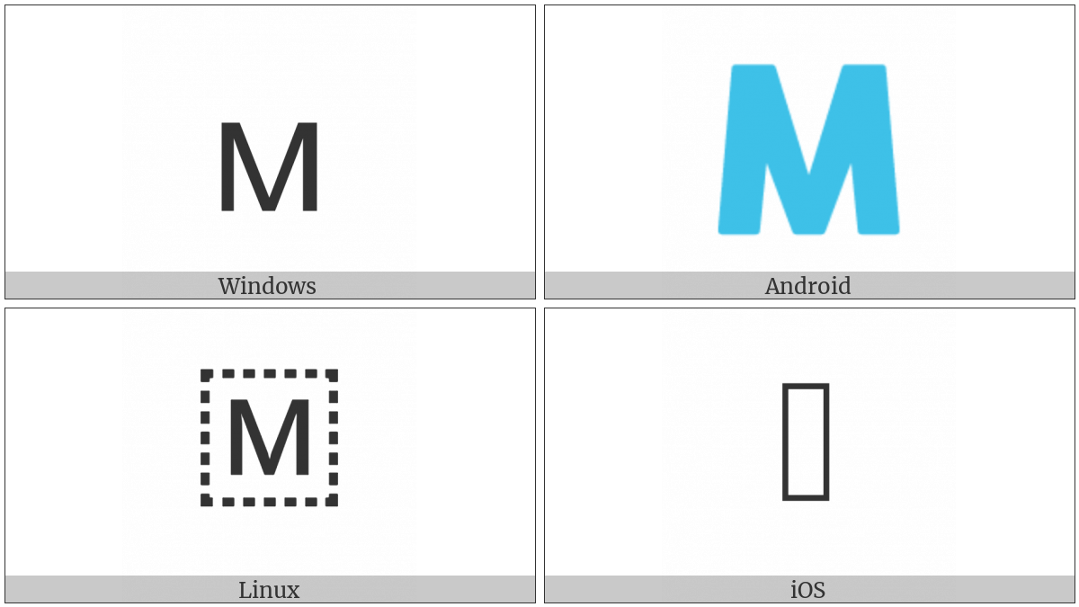 The image below shows how the “Regional Indicator Symbol Letter M” symbol might look like on different operating systems. If the font in which this web site is displayed does not contain the symbol and there is no fallback font able to render it, you can use the image below to get an idea of what it should look like.