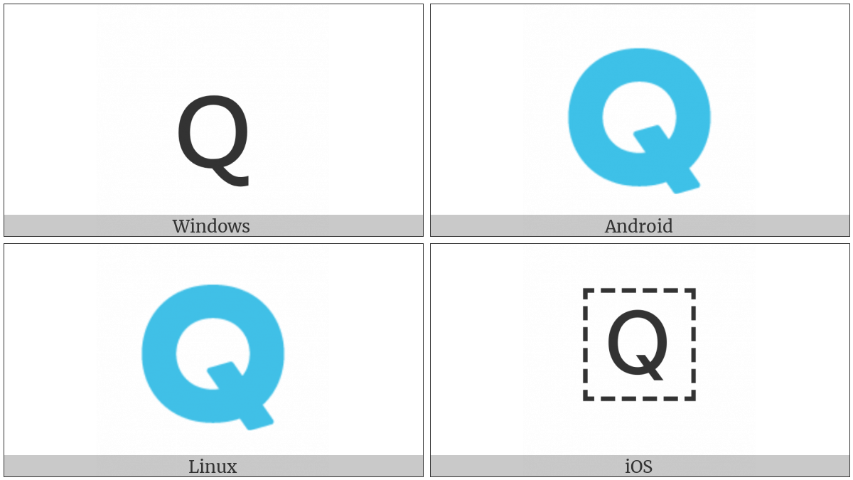 The image below shows how the “Regional Indicator Symbol Letter Q” symbol might look like on different operating systems. If the font in which this web site is displayed does not contain the symbol and there is no fallback font able to render it, you can use the image below to get an idea of what it should look like.