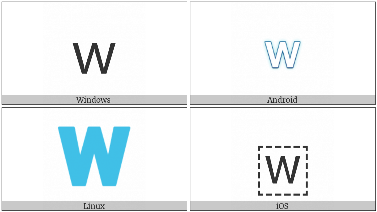 The image below shows how the “Regional Indicator Symbol Letter W” symbol might look like on different operating systems. If the font in which this web site is displayed does not contain the symbol and there is no fallback font able to render it, you can use the image below to get an idea of what it should look like.