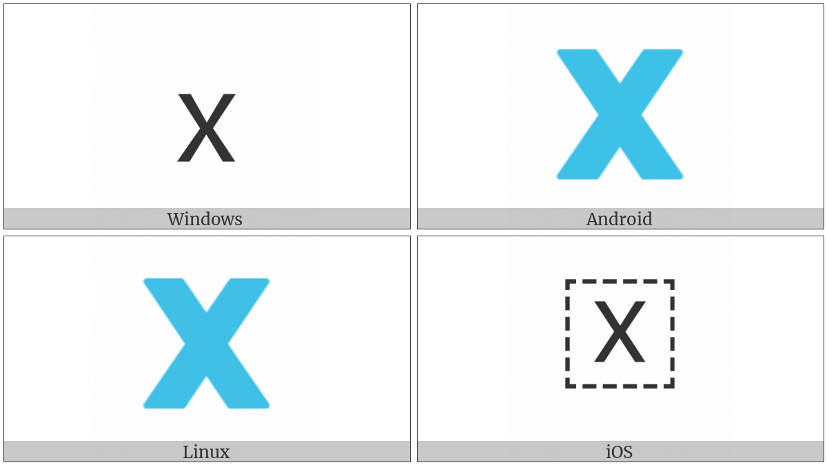 The image below shows how the “Regional Indicator Symbol Letter X” symbol might look like on different operating systems. If the font in which this web site is displayed does not contain the symbol and there is no fallback font able to render it, you can use the image below to get an idea of what it should look like.