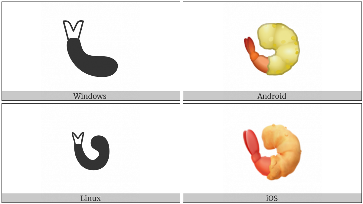 The image below shows how the “Fried Shrimp” symbol might look like on different operating systems. If the font in which this web site is displayed does not contain the symbol and there is no fallback font able to render it, you can use the image below to get an idea of what it should look like.