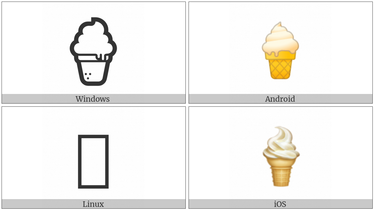 The image below shows how the “Soft Ice Cream” symbol might look like on different operating systems. If the font in which this web site is displayed does not contain the symbol and there is no fallback font able to render it, you can use the image below to get an idea of what it should look like.