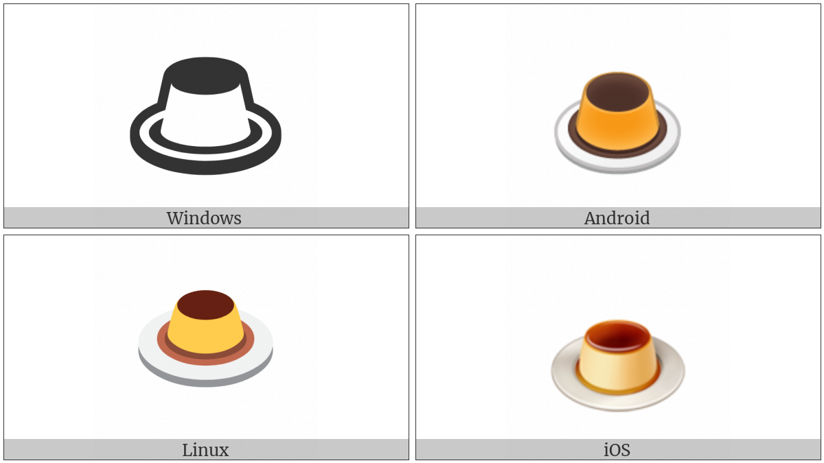 The image below shows how the “Custard” symbol might look like on different operating systems. If the font in which this web site is displayed does not contain the symbol and there is no fallback font able to render it, you can use the image below to get an idea of what it should look like.