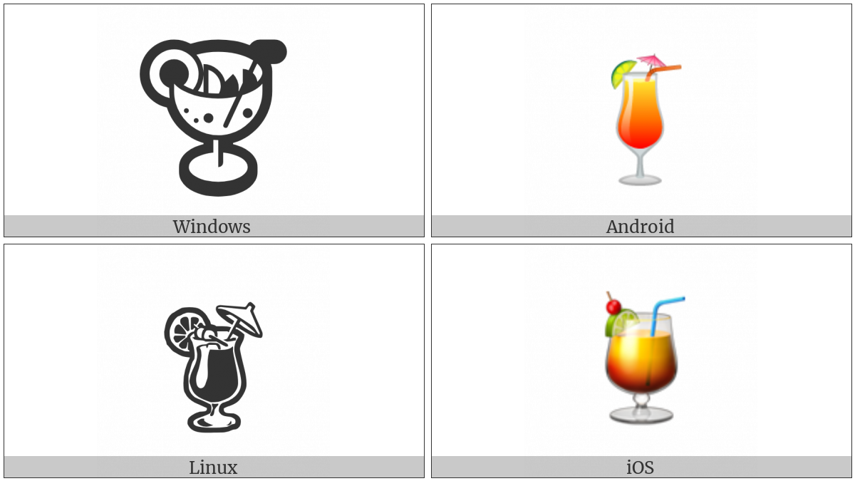 The image below shows how the “Tropical Drink” symbol might look like on different operating systems. If the font in which this web site is displayed does not contain the symbol and there is no fallback font able to render it, you can use the image below to get an idea of what it should look like.