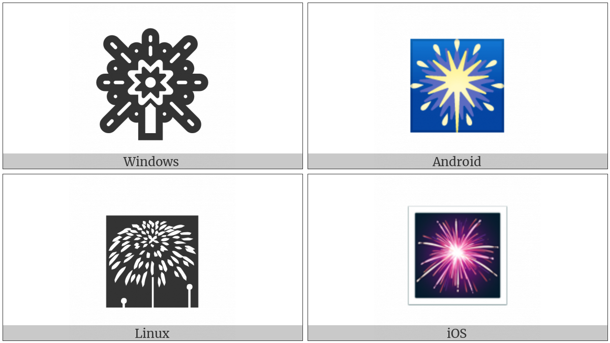 The image below shows how the “Fireworks” symbol might look like on different operating systems. If the font in which this web site is displayed does not contain the symbol and there is no fallback font able to render it, you can use the image below to get an idea of what it should look like.