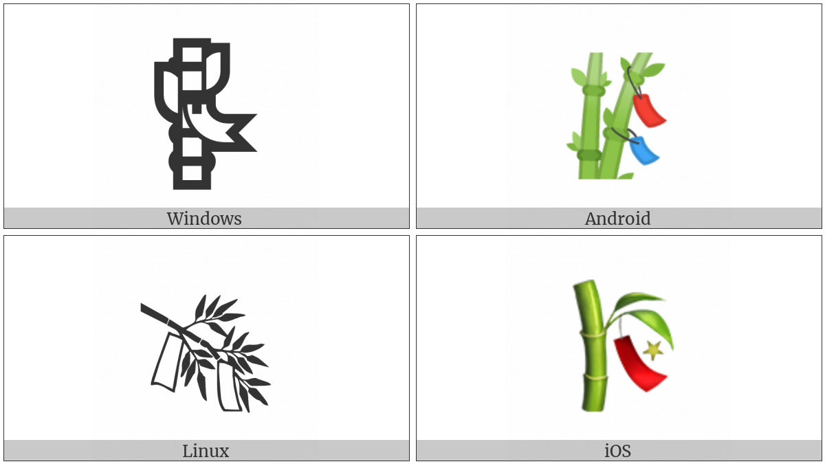 The image below shows how the “Tanabata Tree” symbol might look like on different operating systems. If the font in which this web site is displayed does not contain the symbol and there is no fallback font able to render it, you can use the image below to get an idea of what it should look like.
