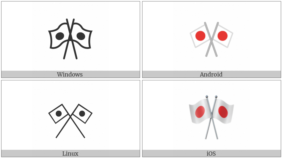 The image below shows how the “Crossed Flags” symbol might look like on different operating systems. If the font in which this web site is displayed does not contain the symbol and there is no fallback font able to render it, you can use the image below to get an idea of what it should look like.