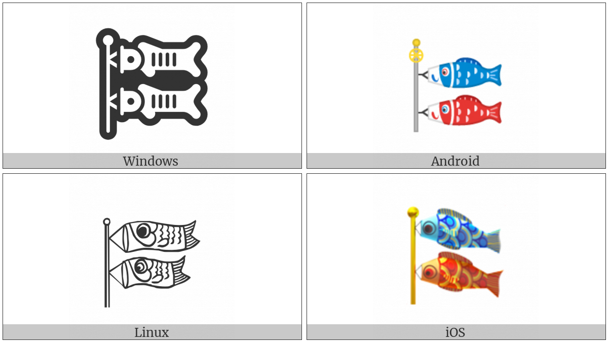 The image below shows how the “Carp Streamer” symbol might look like on different operating systems. If the font in which this web site is displayed does not contain the symbol and there is no fallback font able to render it, you can use the image below to get an idea of what it should look like.