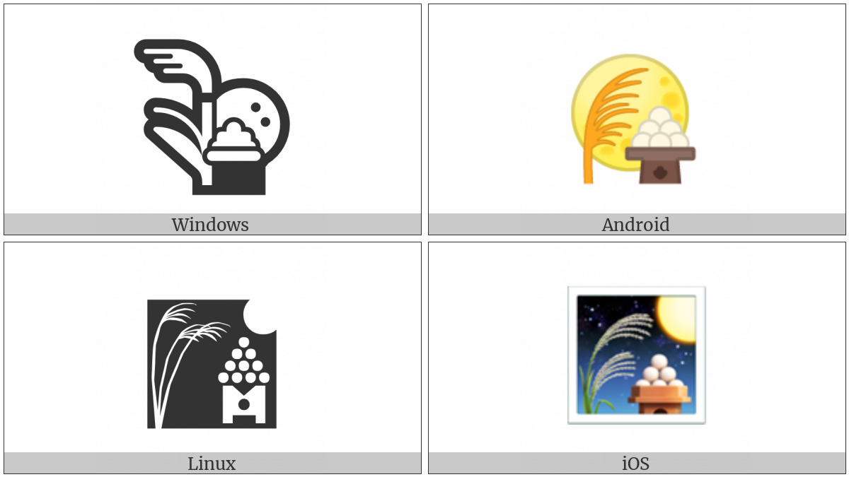 The image below shows how the “Moon Viewing Ceremony” symbol might look like on different operating systems. If the font in which this web site is displayed does not contain the symbol and there is no fallback font able to render it, you can use the image below to get an idea of what it should look like.