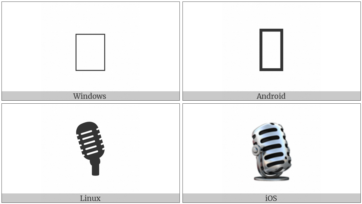 The image below shows how the “Studio Microphone” symbol might look like on different operating systems. If the font in which this web site is displayed does not contain the symbol and there is no fallback font able to render it, you can use the image below to get an idea of what it should look like.