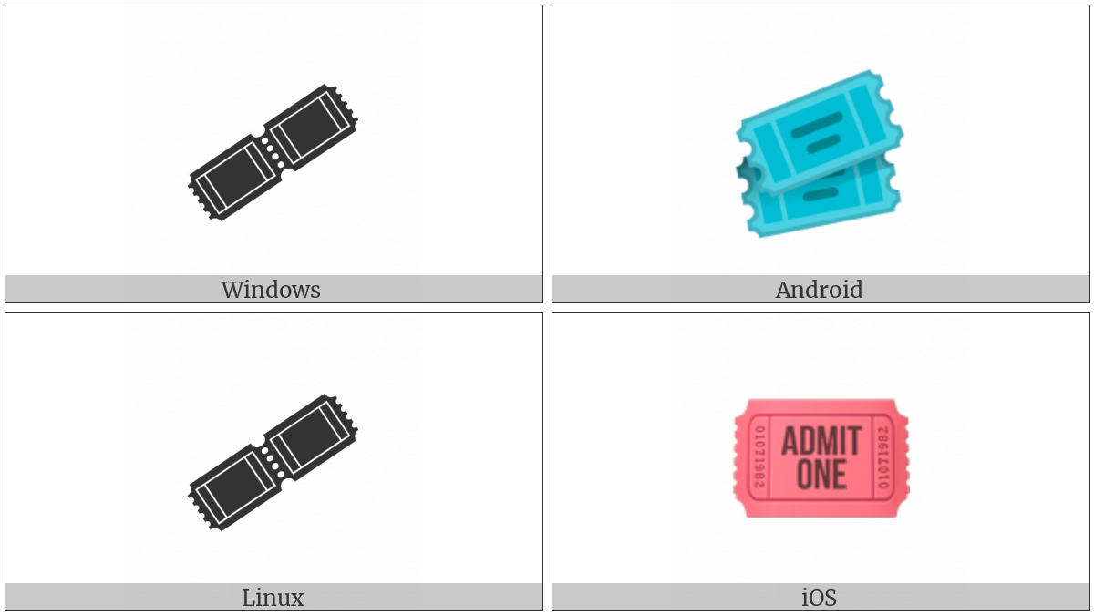 The image below shows how the “Admission Tickets” symbol might look like on different operating systems. If the font in which this web site is displayed does not contain the symbol and there is no fallback font able to render it, you can use the image below to get an idea of what it should look like.