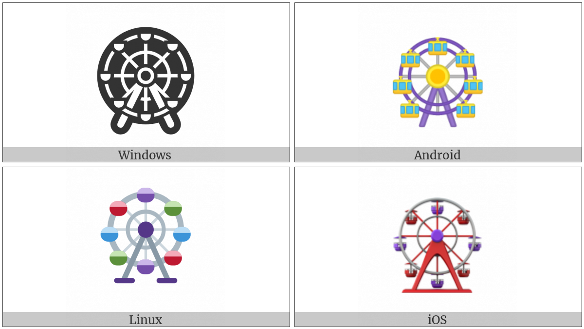 The image below shows how the “Ferris Wheel” symbol might look like on different operating systems. If the font in which this web site is displayed does not contain the symbol and there is no fallback font able to render it, you can use the image below to get an idea of what it should look like.