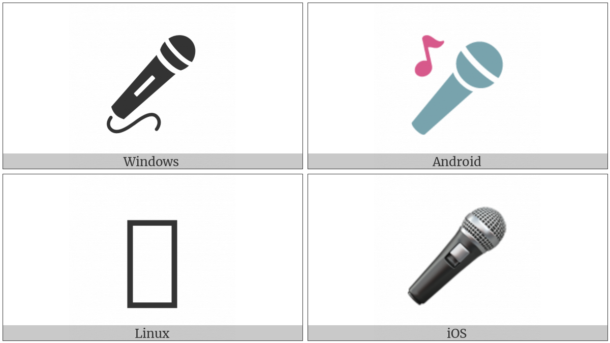 The image below shows how the “Microphone” symbol might look like on different operating systems. If the font in which this web site is displayed does not contain the symbol and there is no fallback font able to render it, you can use the image below to get an idea of what it should look like.