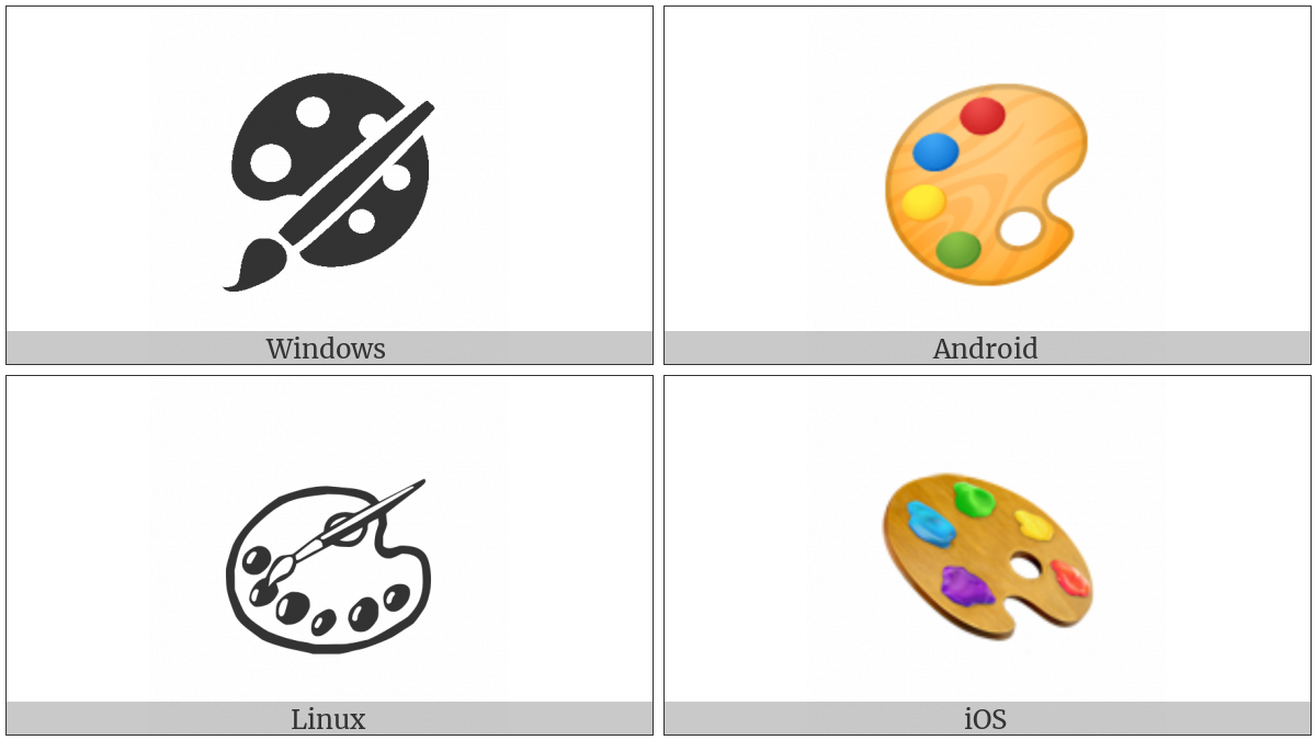 The image below shows how the “Artist Palette” symbol might look like on different operating systems. If the font in which this web site is displayed does not contain the symbol and there is no fallback font able to render it, you can use the image below to get an idea of what it should look like.