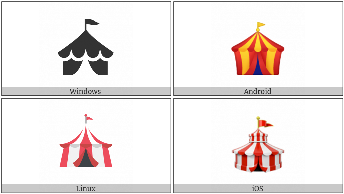 The image below shows how the “Circus Tent” symbol might look like on different operating systems. If the font in which this web site is displayed does not contain the symbol and there is no fallback font able to render it, you can use the image below to get an idea of what it should look like.