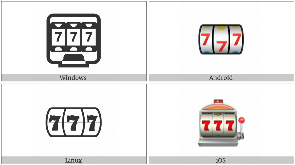 The image below shows how the “Slot Machine” symbol might look like on different operating systems. If the font in which this web site is displayed does not contain the symbol and there is no fallback font able to render it, you can use the image below to get an idea of what it should look like.