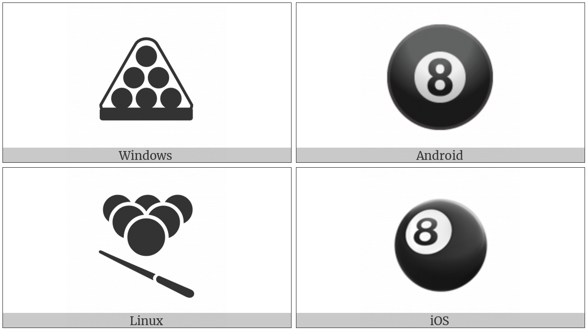 The image below shows how the “Billiards” symbol might look like on different operating systems. If the font in which this web site is displayed does not contain the symbol and there is no fallback font able to render it, you can use the image below to get an idea of what it should look like.