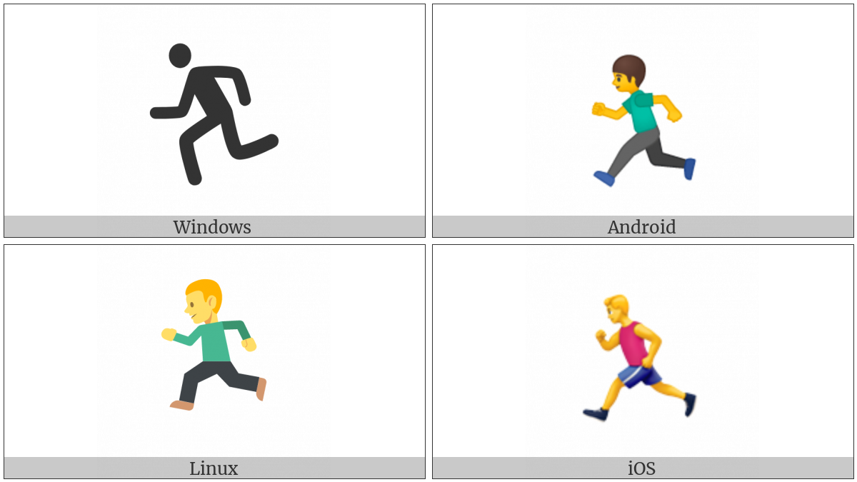 The image below shows how the “Runner” symbol might look like on different operating systems. If the font in which this web site is displayed does not contain the symbol and there is no fallback font able to render it, you can use the image below to get an idea of what it should look like.
