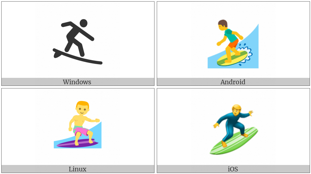 The image below shows how the “Surfer” symbol might look like on different operating systems. If the font in which this web site is displayed does not contain the symbol and there is no fallback font able to render it, you can use the image below to get an idea of what it should look like.