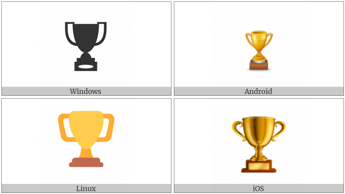 The image below shows how the “Trophy” symbol might look like on different operating systems. If the font in which this web site is displayed does not contain the symbol and there is no fallback font able to render it, you can use the image below to get an idea of what it should look like.