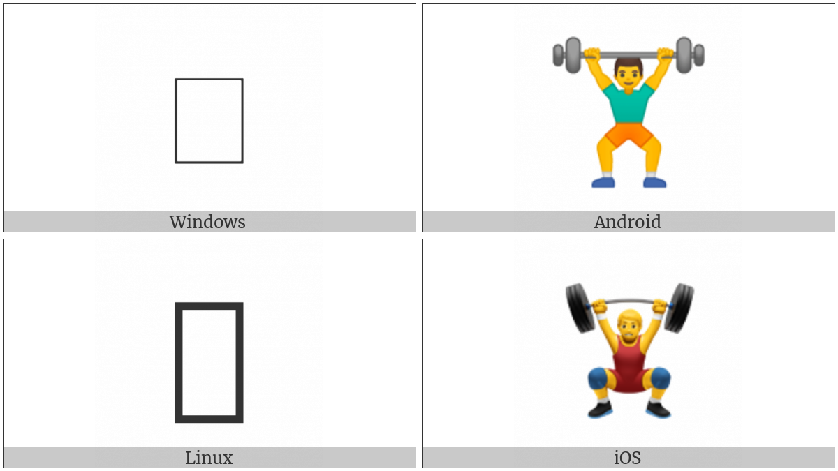 The image below shows how the “Weight Lifter” symbol might look like on different operating systems. If the font in which this web site is displayed does not contain the symbol and there is no fallback font able to render it, you can use the image below to get an idea of what it should look like.