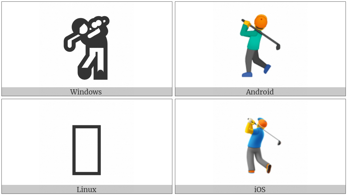 The image below shows how the “Golfer” symbol might look like on different operating systems. If the font in which this web site is displayed does not contain the symbol and there is no fallback font able to render it, you can use the image below to get an idea of what it should look like.