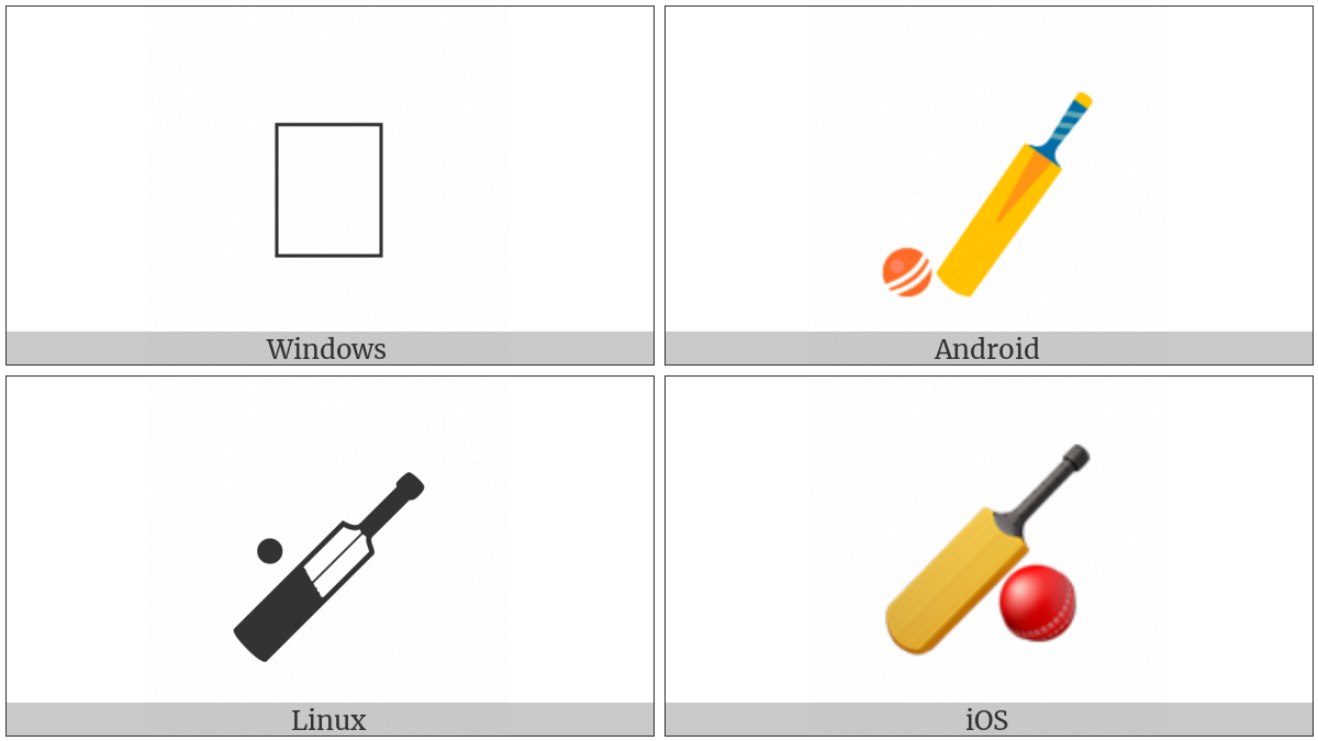 The image below shows how the “Cricket Bat And Ball” symbol might look like on different operating systems. If the font in which this web site is displayed does not contain the symbol and there is no fallback font able to render it, you can use the image below to get an idea of what it should look like.