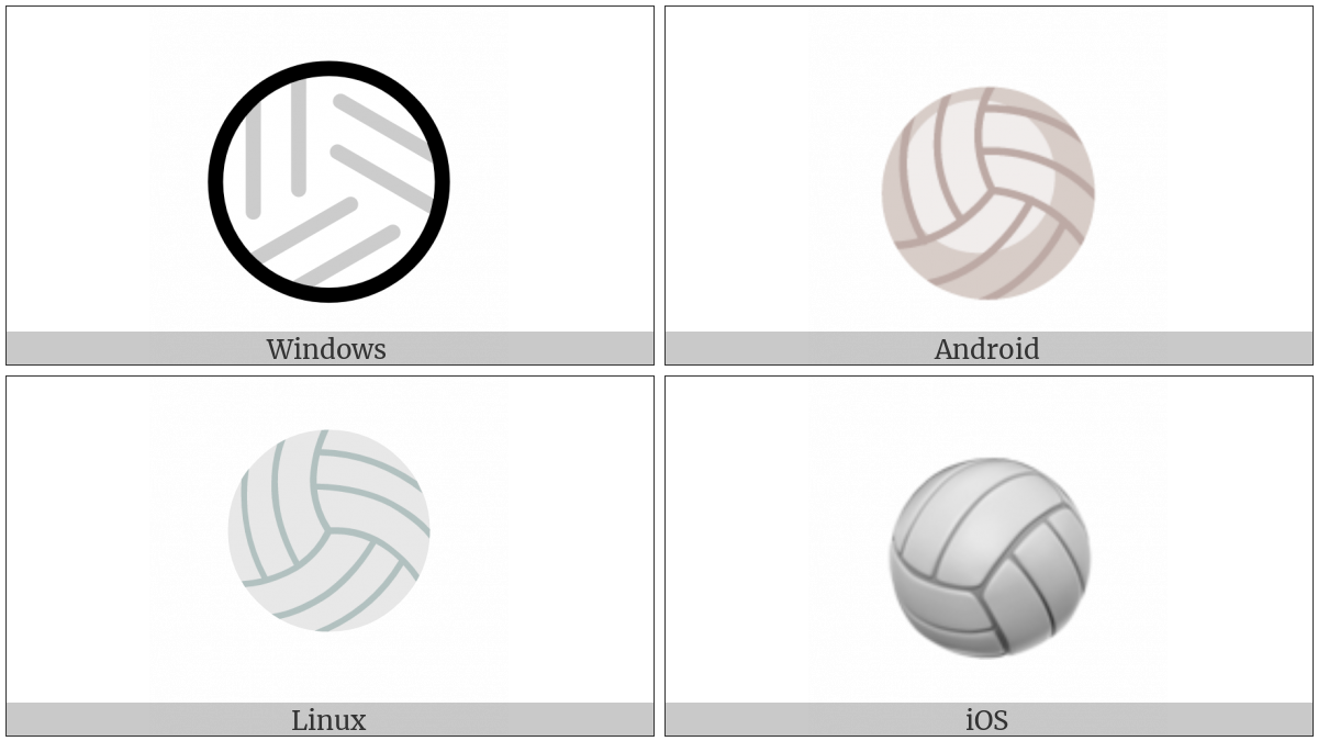 The image below shows how the “Volleyball” symbol might look like on different operating systems. If the font in which this web site is displayed does not contain the symbol and there is no fallback font able to render it, you can use the image below to get an idea of what it should look like.