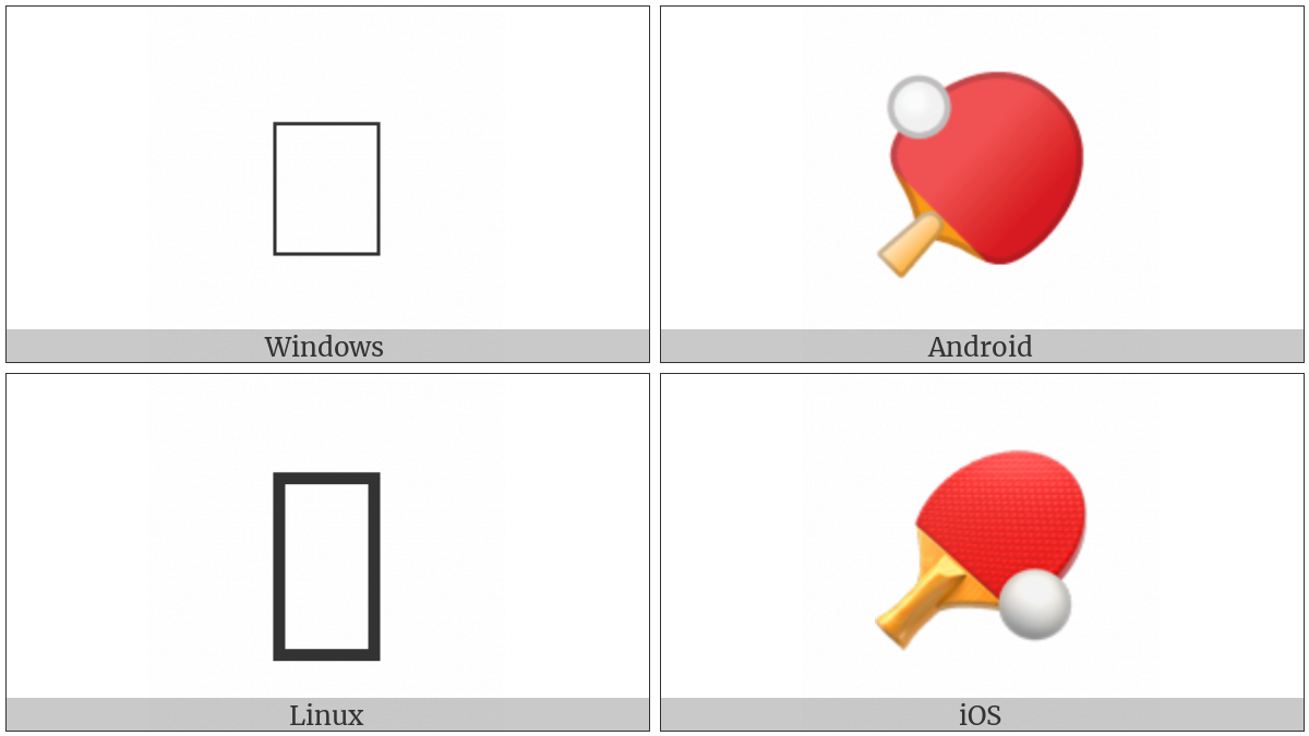 The image below shows how the “Table Tennis Paddle And Ball” symbol might look like on different operating systems. If the font in which this web site is displayed does not contain the symbol and there is no fallback font able to render it, you can use the image below to get an idea of what it should look like.