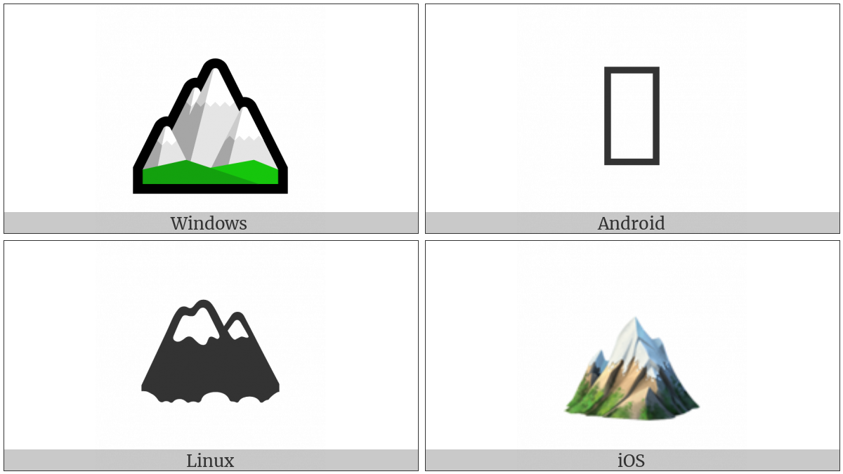 The image below shows how the “Snow Capped Mountain” symbol might look like on different operating systems. If the font in which this web site is displayed does not contain the symbol and there is no fallback font able to render it, you can use the image below to get an idea of what it should look like.
