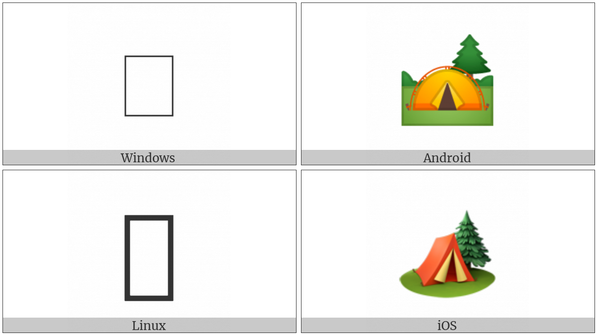 The image below shows how the “Camping” symbol might look like on different operating systems. If the font in which this web site is displayed does not contain the symbol and there is no fallback font able to render it, you can use the image below to get an idea of what it should look like.