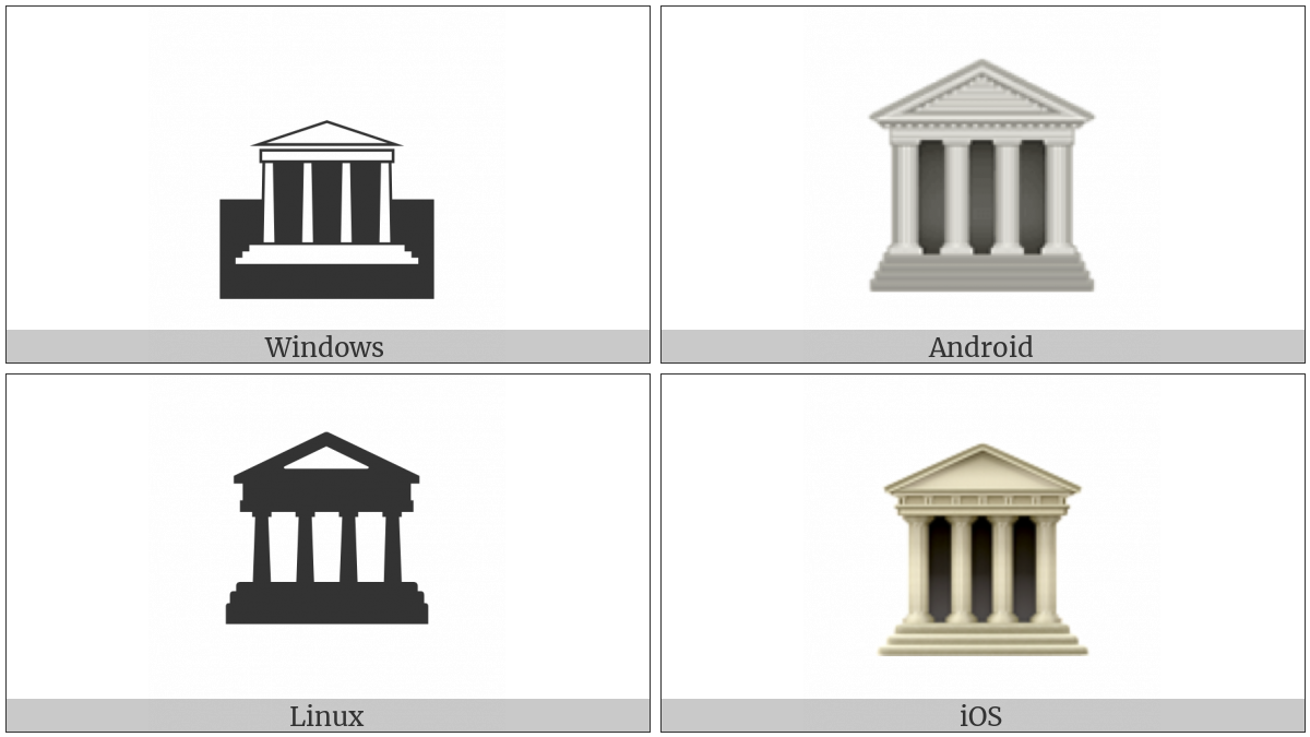 The image below shows how the “Classical Building” symbol might look like on different operating systems. If the font in which this web site is displayed does not contain the symbol and there is no fallback font able to render it, you can use the image below to get an idea of what it should look like.