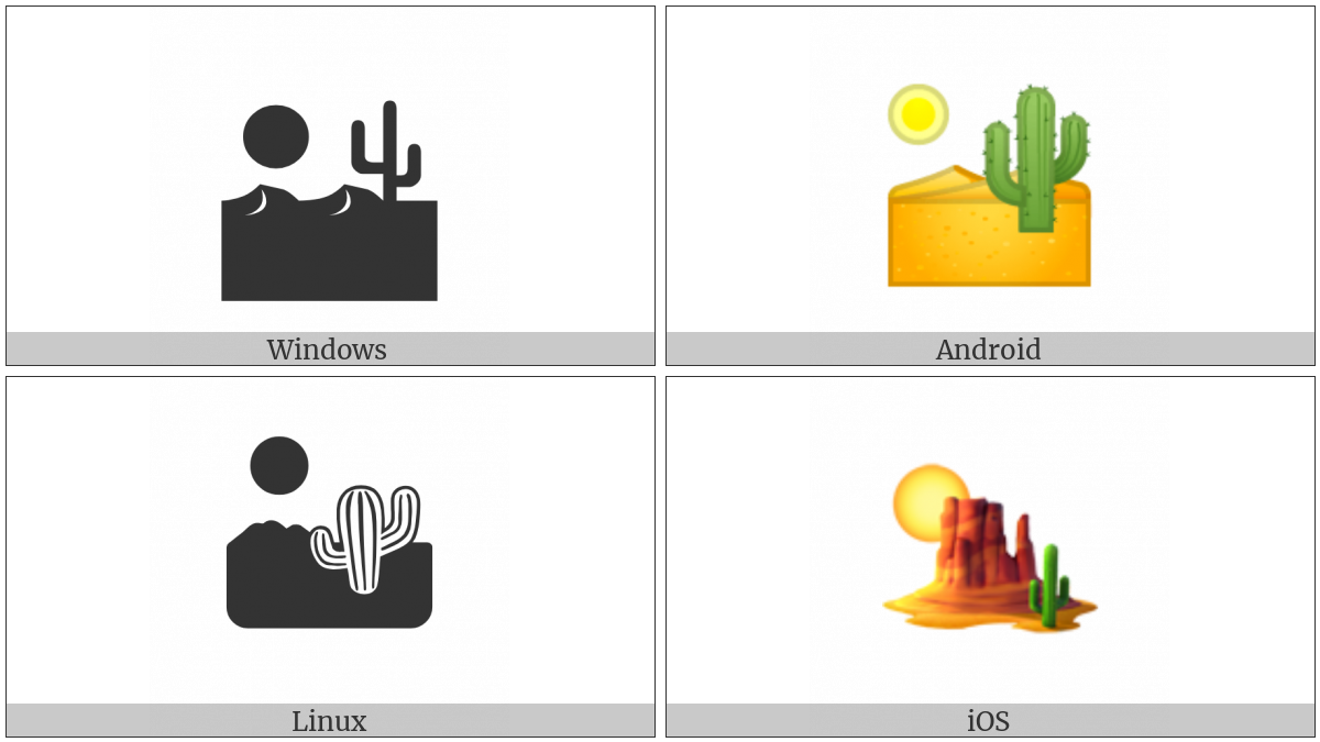 The image below shows how the “Desert” symbol might look like on different operating systems. If the font in which this web site is displayed does not contain the symbol and there is no fallback font able to render it, you can use the image below to get an idea of what it should look like.