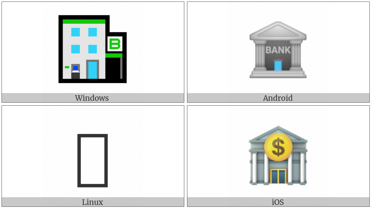 The image below shows how the “Bank” symbol might look like on different operating systems. If the font in which this web site is displayed does not contain the symbol and there is no fallback font able to render it, you can use the image below to get an idea of what it should look like.