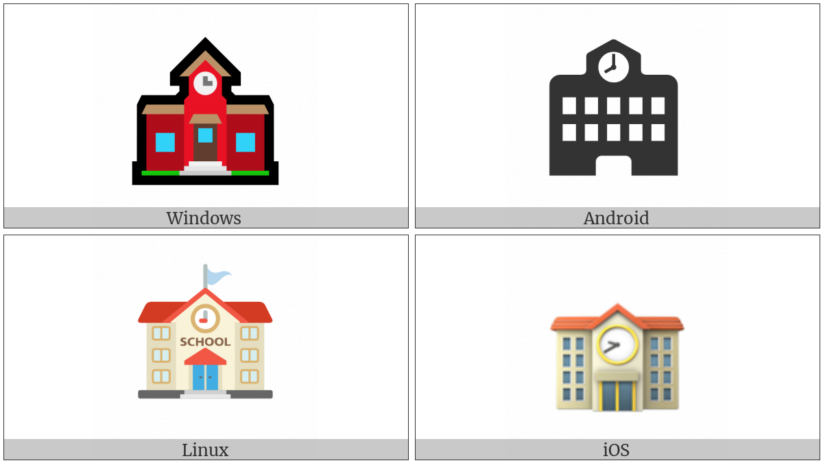 The image below shows how the “School” symbol might look like on different operating systems. If the font in which this web site is displayed does not contain the symbol and there is no fallback font able to render it, you can use the image below to get an idea of what it should look like.