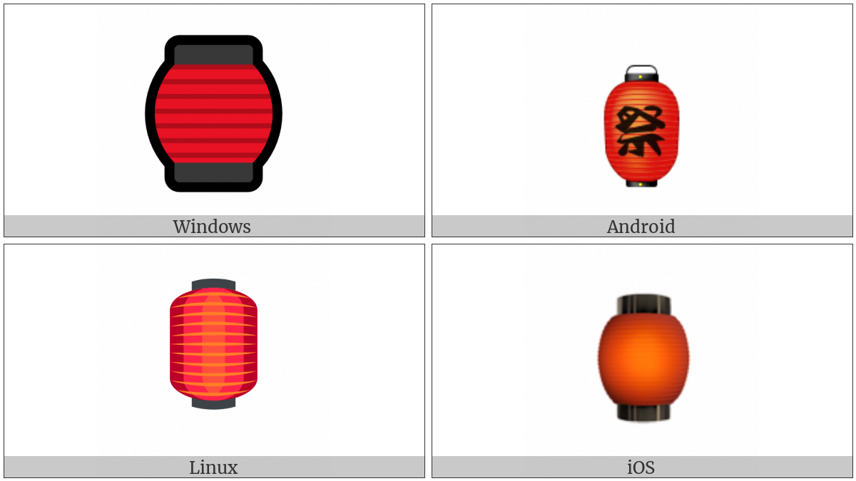 The image below shows how the “Izakaya Lantern” symbol might look like on different operating systems. If the font in which this web site is displayed does not contain the symbol and there is no fallback font able to render it, you can use the image below to get an idea of what it should look like.