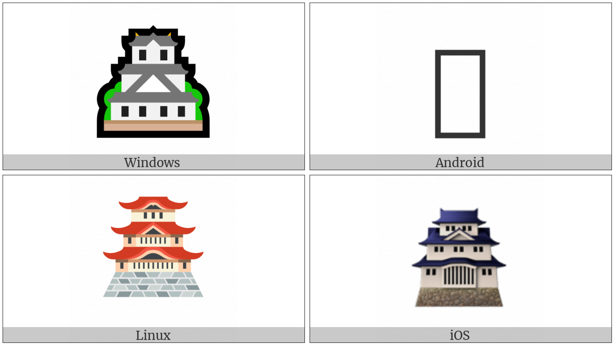 The image below shows how the “Japanese Castle” symbol might look like on different operating systems. If the font in which this web site is displayed does not contain the symbol and there is no fallback font able to render it, you can use the image below to get an idea of what it should look like.