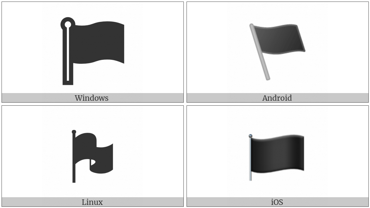 The image below shows how the “Waving Black Flag” symbol might look like on different operating systems. If the font in which this web site is displayed does not contain the symbol and there is no fallback font able to render it, you can use the image below to get an idea of what it should look like.