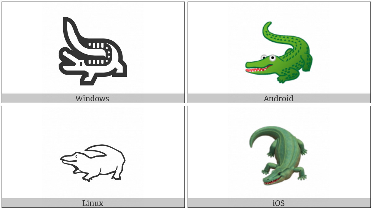 The image below shows how the “Crocodile” symbol might look like on different operating systems. If the font in which this web site is displayed does not contain the symbol and there is no fallback font able to render it, you can use the image below to get an idea of what it should look like.