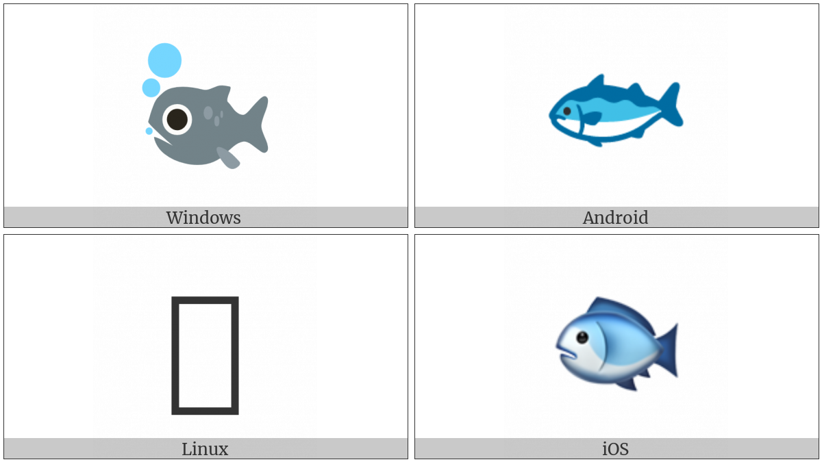 The image below shows how the “Fish” symbol might look like on different operating systems. If the font in which this web site is displayed does not contain the symbol and there is no fallback font able to render it, you can use the image below to get an idea of what it should look like.