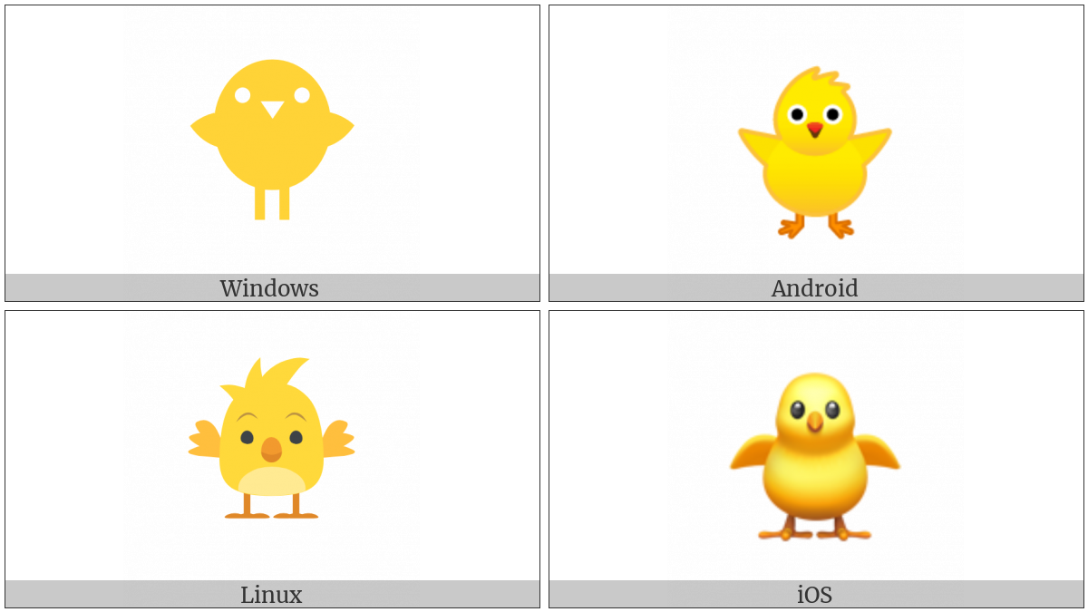 The image below shows how the “Front-Facing Baby Chick” symbol might look like on different operating systems. If the font in which this web site is displayed does not contain the symbol and there is no fallback font able to render it, you can use the image below to get an idea of what it should look like.